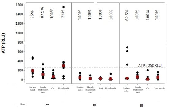 Graphs were prepared to observe the behavior of each ATP (RLU) and aerobic bacterial count (CFU) values per assessed surface and per stage. In this case, values below 250 RLU and 2.5 CFU/cm2 were considered as indicative of surface approval. Figure 1 shows the individual values’ graph for the ATP rates of the four surfaces in the three stages after intervention.