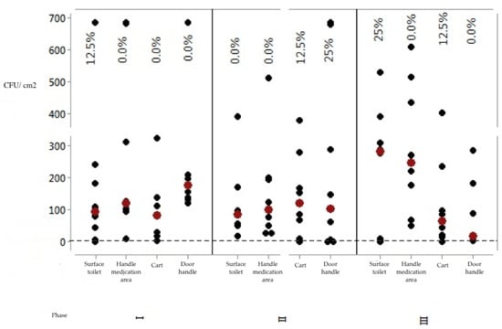 Microbial count values for surfaces in the three phases assessed. Coxim, MS, Brazil, 2018/2019. Note: Percentages related to approval rates. Black dots indicate individual CFU/cm2 values and red dots indicate data medians.