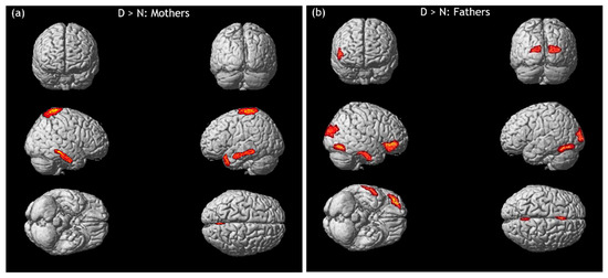 Cortical representation of the cluster of voxels in which the high-density electroencephalography (hdEEG) signal was higher in response to infant distressed emotions (D) than in response to neutral faces (N), in mothers (a) and fathers (b) respectively. Regional details are presented in Table 1.