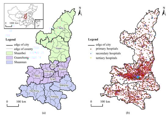 Study-area overview. (a) Shaanxi province; (b) public medical facilities.