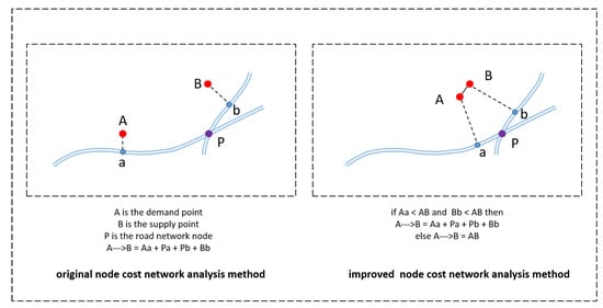 This article used an improved version of node cost network analysis method (Figure 2) []. Since spatial nodes in the study area did not completely fall on roads, the node cost network analysis method incorporates space-time distance cost from the starting and ending points to the roads into network analysis. However, considering that when the road network in the province was digitized, some roads were deleted or omitted because of their low level, the distance between starting and ending nodes is closer, but nodes are far from the road, and outliers were generated during the final network analysis. Therefore, this article set several conditions for the node cost network analysis method to improve it: When the cost of directly connecting the start and end nodes on the road network was less than the cost from the starting or ending nodes to the road network, the distance between starting and ending nodes used Euclidean distance as the network analysis result; otherwise, the result of node cost network analysis was used. When the distance was greater than threshold d, the time cost calculation used the road speed of 25 km/h; otherwise, the walking speed of 5 km/h was used. The choice of threshold d refers to other studies [,,], and it was set as the distance that residents can walk in 15 min (1250 m).