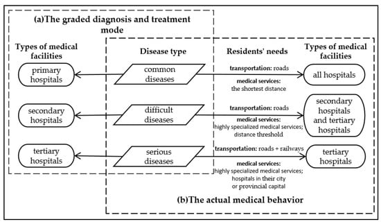 Different from the “graded diagnosis and treatment” model advocated by the government, medical-service levels were divided according to the actual medical demands of residents in Shaanxi (Figure 3). Residents have different medical needs and medical behaviors because of different types of diseases. Related studies divided diseases into common, difficult, and serious diseases according to the severity [], and there are differences in medical-treatment patterns among residents under different disease types. In the case of common diseases, residents pay more attention to how to obtain medical resources with less space-time cost, but have weak requirements on the service level of medical facilities. Therefore, we selected all medical institutions in the province to provide primary medical services. With regard to difficult diseases, residents pay attention to the space-time cost to obtain medical services, and the service level and competition intensity of medical facilities. So, secondary general, traditional Chinese medicine, integrated Chinese and Western medicine, specialized hospitals and tertiary hospitals were selected for providing secondary medical services (376). With regard to serious diseases, residents are more concerned about the service level of medical institutions and have weak requirements for the space-time cost of obtaining medical resources. They usually choose tertiary hospitals in their city or provincial capital city for medical services, and the railway is also considered for transportation mode. In this article, 87 tertiary medical institutions were selected for tertiary medical services.