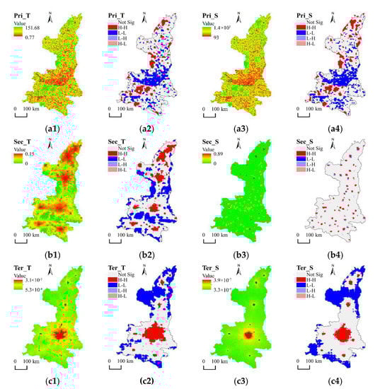 Spatial-correlation patterns of accessibility in various regions exhibited spatial agglomeration characteristics (Table 1), but the aggregation degree of Sec_S was relatively low and the aggregation range is small. The reason is that traffic conditions restrict the travel range of residents, lowering the accessibility of many regions in the province, and resulting in a decrease in the level of agglomeration.
