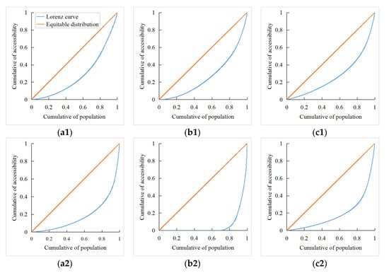 The Gini coefficient can be calculated with the Lorenz curve, which is a visual expression of equity of accessibility to three-level medical services in Shaanxi. The horizontal axis represents population accumulation, and the vertical axis represents accessibility accumulation. The diagonal line connecting the two ends of the curve is an equal-distribution line [,]. The Gini coefficient is the ratio of the area between the equal-distribution line and the Lorenz curve to the area of all regions under the equal-distribution line. The greater spatial differences in accessibility was, the larger value of Gini coefficient was.