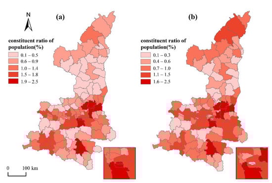 In order to study the relationship between accessibility and group distribution, Pearson correlation analysis was performed between population-composition data and county accessibility (Table 3). On the provincial scale, there was no obvious correlation between aging-population ratio and accessibility, while agricultural–population ratio was significantly related to accessibility. The higher agricultural–population ratio was, the lower level of accessibility to three-level medical services was.