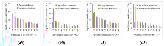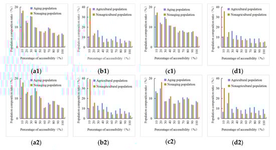 Similarly, Figure 7(b1–b3,d1–d3) are the composition ratio of the agricultural and nonagricultural populations with different percentiles of Pri_T, Sec_T, Ter_T, Pri_S, Sec_S, Ter_S levels, respectively. Under different accessibility quantiles, the agricultural and nonagricultural population was quite different. Due to different social divisions of labor, the agricultural population was more distributed in remote areas with lower accessibility levels. Spatial isolation led to a significantly lower agricultural-population composition ratio than that of the nonagricultural population in high-accessibility areas, and ultimately resulted in group differences, which is more evident in the top 10% quantile of accessibility. Therefore, different vulnerable groups had differences in their ability to obtain medical resources. In order to improve the equity of accessibility, policy makers should specifically consider the situation of various groups in different regions.