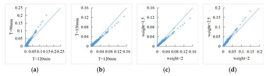 Figure 8a,b are comparisons of scatter plots of accessibility with different service thresholds. Accessibility numerical-values were generally distributed along the 45 degree line, and threshold selection did not cause the accessibility numerical-value to obviously change. Similarly, Figure 8c,d are comparisons of scatter plots of accessibility with different service-capacity weights. The change of weights made accessibility linearly change, but the range was small, and the overall accessibility numerical-value was still distributed around the 45 degree line.