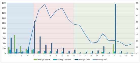 To analyze the long-term data more intuitively, we divided the duration from 31 November 2019 to 19 April 2020 into 22 groups (Table 2), each group contained five days. After this step, we calculated the average count of each day’s post of the Wuhan Release of each group. Then, we obtained the count average count of the repost, comments, and likes of each post of each group, and to avoid the influence of abnormal value, we remove the extremum of the repost, comment, and likes. Even so, there were some extreme values in Figure 1, and we will take this into account in our analysis.