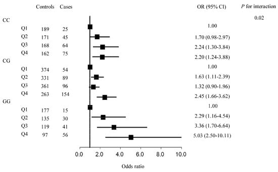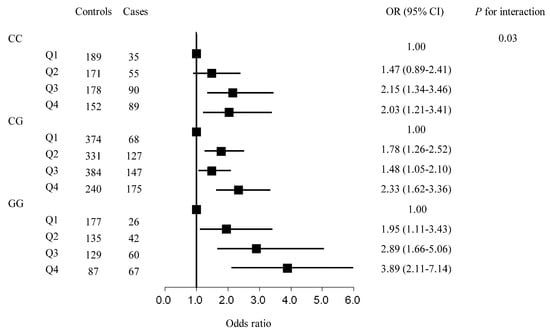 We further performed stratified analyses by rs2910164 genotype. The results showed that there was a significant interaction between cIMT and rs2910164 genotype with the risk of IS (p interaction = 0.03) and LAA (p interaction = 0.02). Figure 1 shows the results of rs2910164-cIMT interaction for IS. Among participants who carried rs2910164_GG genotype, the OR (95% CI) of cIMT in the highest quartile vs. the lowest quartile was 3.89 (2.11–7.14) with the risk of IS; and the corresponding estimate was 2.03 (1.21–3.41) for participants with the rs2910164_CC genotype. In addition, the magnitude of rs2910164-cIMT interaction for LAA subtype is shown in Figure 2. We found that the OR (95% CI) of cIMT in the highest quartile vs. the lowest quartile with LAA subtype was 5.03 (2.50–10.11) among participants with rs2910164_GG genotype, which was higher than that of 2.20 (1.24–3.88) among participants with rs2910164_CC genotype.