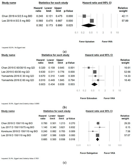 The further analysis showed a ranking from lower to higher risk of NOACs compared with VKAs was apixaban (HR: 0.392; 95% CI, 0.173 to 0.890; p = 0.025; I2: 82.0%) (Figure 4a), edoxaban (HR: 0.603; 95% CI, 0.434 to 0.839; p = 0.003; I2: 35.0%) (Figure 4b), dabigatran (HR: 0.685; 95% CI, 0.500 to 0.938; p = 0.018; I2: 35.4%) (Figure 4c), and rivaroxaban (HR: 0.794; 95% CI, 0.697 to 0.904; p = 0.001; I2: 0%) (Figure 4d).
