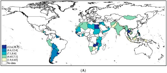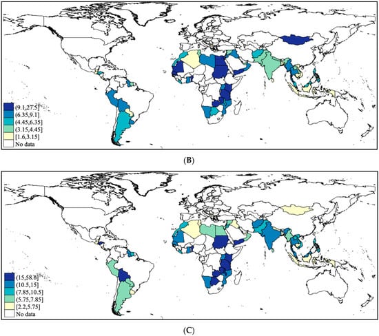 Prevalence of never/rarely washing hands before eating, after using toilet, and with soap by country. (A) Prevalence of adolescents who never or rarely wash hands before eating; (B) Prevalence of adolescents who never or rarely wash hands after using the toilet; (C) Prevalence of adolescents who rarely or never use soap when washing hands.