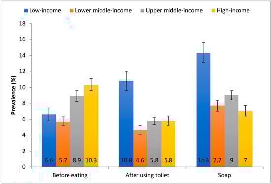 Prevalence of never/rarely washing hands before eating, after using toilet, and with soap by country-income level. Bars denote 95% confidence interval.