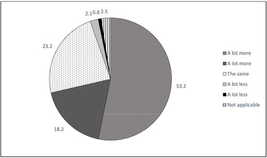 Descriptive results of participants’ estimation of changes in their online media consumption (question: “Did your media consumption change since the beginning of the COVID-19 lockdown restrictions?”) are displayed in Figure 1. The majority of participants reported an increase in their online activities, with 53.2% using online media a bit more and 18.2% using it a lot more than before.