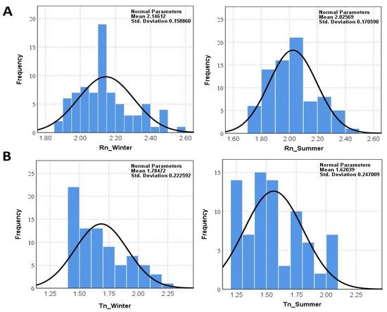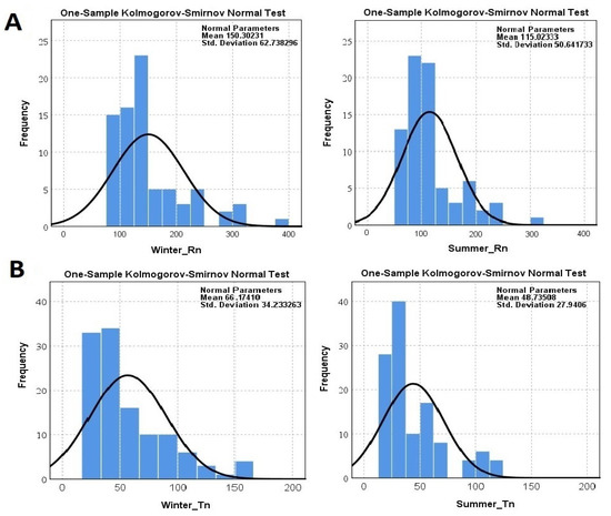 Normal Distribution of indoor (A) radon and (B) thoron concentrations (Bq m−3) over the two seasons at the ground level of dwellings examined in Mashhad.