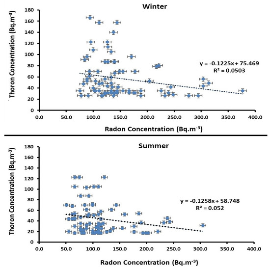Correlation between the indoor radon and thoron concentrations of the 78 houses examined in Mashhad over two seasons.