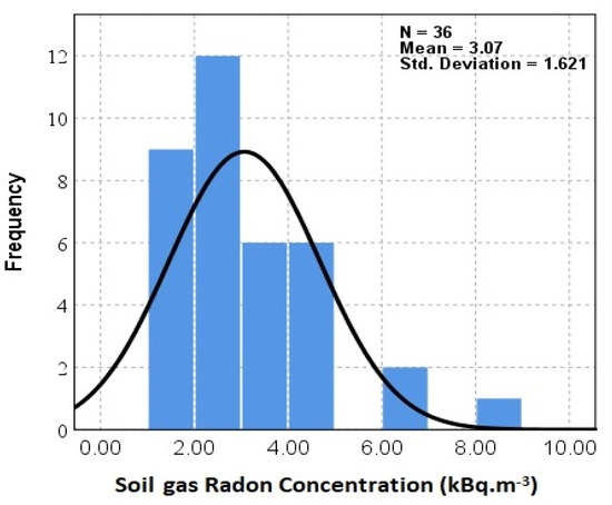 The soil-gas radon concentrations (kBq m−3) in the studied area.