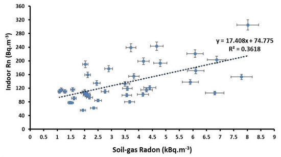 As previously discussed, the main source of indoor 222Rn originates from soil gas infiltration, 222Rn concentrations in the soil gas of different districts in Mashhad were measured by using a passive method based on CR-39 detectors in the summer when soil moisture and precipitation are low. In order to determine soil gas radon concentrations, only 36 NRPB dosimeters were retrieved from where they were set up, while the remaining 6 dosimeters were considered lost. Figure 5 shows a histogram of soil gas radon concentrations in Mashhad during the summer. The soil gas radon concentrations recorded in the studied area fell within the range of 1.07 ± 0.28 to 8.02 ± 0.65 kBq·m−3 with a mean value of 3.07 ± 1.09 kBq m−3. As is shown in Figure 4, the activity concentrations of 222Rn vary from location to location, possibly because of the physic geological properties of the types of soil studied, topographic differences, as well as geomorphology and meteorological conditions of the region. The average radon concentrations in both soil gas and indoor environments are approximately the minimum and maximum values in the same region, respectively. Moreover, the correlation between indoor radon and soil gas radon concentrations for the districts studied is shown in Figure 6. The correlation analysis yielded a positive correlation (R2 = 0.361) between average indoor radon and soil-gas radon concentrations.