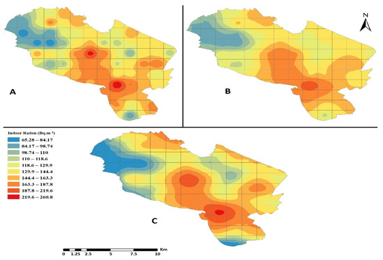 Predicted Indoor Radon Map of Mashhad dwellings over a grid with the dimensions of 1 km × 1 km using the (A) Inverse distance weighting, (B) Empirical Bayesian Kriging, and (C) Ordinary Kriging interpolation techniques.