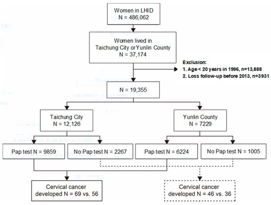 The National Health Insurance of Taiwan is a universal health insurance system, established in 1995, with 96% of 2.3 million people covered and over 95% of hospitals and clinics contracted by the end of 1996 [23]. This study obtained the Longitudinal Health Insurance Database (LHID) from the National Health Research Institutes (NHRI), which included the claims data of one million insured population randomly selected from a total of 23 million residents in Taiwan. From this database, we identified all women aged 20 years and older: 12,126 from the urban city of Taichung and 7229 from the rural county of Yunlin, which are both located in central Taiwan and covered in the insurance scheme of 1996–2013 (Figure 1).