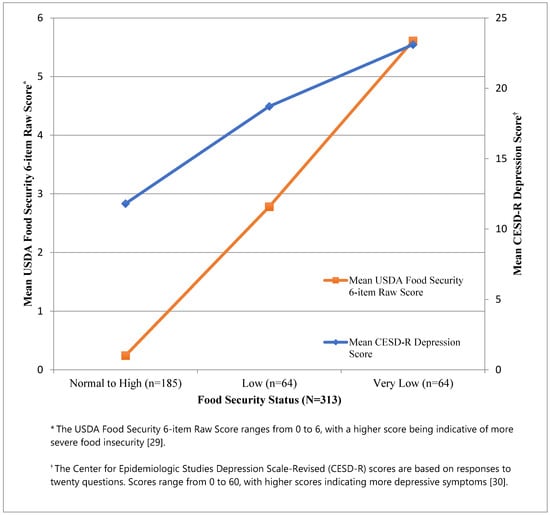 The association between food insecurity and depression noted in our ECE sample is consistent with that of several previous studies that look at this association within vulnerable populations and predominantly female samples [4,5,18,35]. In a recent cross-sectional analysis of the National Health and Nutrition Examination Survey (2011–2014), authors report a dose–response relationship between food insecurity and depressive symptoms among diabetic adults with an odds ratio of similar magnitude to those noted in our study [35]. A second cross-sectional analysis of low-income, diabetic participants, in King County, WA, also found that being food insecure (versus secure) was associated with almost 3-times higher odds of depression, similar to our finding for food insecure adults [36]. Results from the Women’s Employment Study similarly reported that household food insufficiency was associated with depression among low-income female welfare recipients [5]. Moreover, using longitudinal data, Tuthill et al. [18] found that women with very low food security had five times the odds of depression, compared to food secure women [18].