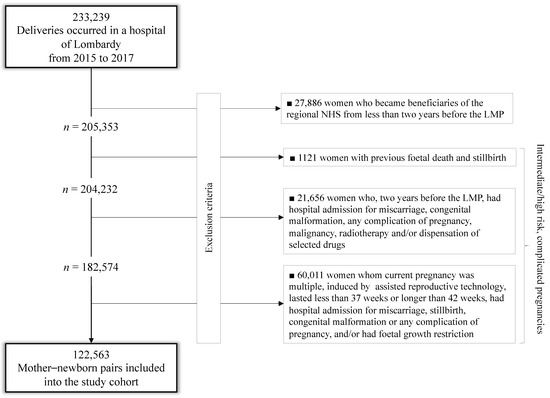Among the 233,239 deliveries that occurred in Lombardy from 2015 to 2017, 27,886 (12%) were excluded because the mother was an NHS beneficiary for less than two years before the last menstrual period (LMP); others 82,790 (40.3%) had signs suggestive of intermediate/high-risk, complicated pregnancies, detected from the entire reproductive history (1121), from investigations limited to two years before LMP (21,658) or from the current pregnancy (60,011). The remaining 122,563 mother–newborn pairs were included in the study cohort (Figure 1).