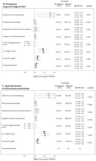 Second, we realized that low exposure prevalence was expected to occur in our cohort (i.e., few women did not adhere with recommendations). For this reason, a cautious approach was adopted by excluding from the calculations exposure–outcome pairs for which our sample size was not sufficient to appreciate a 2.0 minimum detectable PR, with a 0.80 power (i.e., of appreciating as significant PR values so high not being plausible).