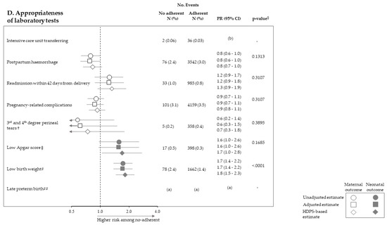 Forest plot picturing the association between exposure to no-adherence with selected recommendations and the risk of maternal or neonatal outcomes. Prevalence ratio (PR) and 95% confidence interval (CI) were estimated with log-binomial regression models. Estimates unadjusted and adjusted for covariates listed in Table 1 are shown. In addition, estimates obtained with high-dimensional propensity score (HDPS) stratification design are displayed. † The 96,837 women who experienced vaginal birth were included into the specific cohort, rather than the 122,563 ones with either vaginal birth or caesarean delivery as for other associations. ‡ Value of the Apgar score at five minutes <7. # Birth weight <2500 g. ## Late preterm birth between the 34th and 36th week. The 125,985 women with gestational age ranging from the 34th to the 42nd week were included in the specific cohort, rather than the 122,563 ones with gestational age from the 37th and the 42nd week as for other associations. § p-value adjusted using the Benjamini–Hochberg false discovery rate control procedure. (a) Because women who had shorter pregnancy duration had less time to experience appropriate care, and as this may lead to misclassified immortal person-time, the specific association was not evaluated (see text). (b) As exposure and outcome were both very rareness, the sample size was not sufficient to appreciate a 2.0 minimum detectable PR, and the specific association was then not evaluated (see text).