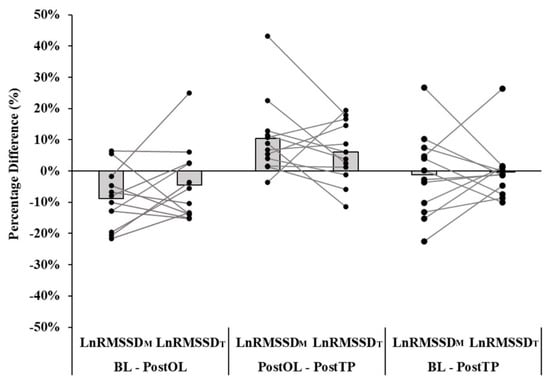 Means and SDs for LnRMSSDM and LnRMSSDT across each time point are presented in Table 2. There was no condition × time interaction (p = 0.363; n2p = 0.088) and no main effect for condition (p = 0.090, n2p = 0.239). There was a significant main effect for time (p = 0.007; n2p = 0.363). LnRMSSDM at PostOL was lower than BL LnRMSSDM (p = 0.019, d = −0.68). PostTP LnRMSSDM was not different from PostOL (p = 0.056, d = 0.80) and BL (p = 0.998, d = −0.10). Compared to BL, LnRMSSDT was not different from PostOL (p = 0.590, d = −0.41) or PostTP (p = 1.000, d = 0.00). There was no change in LnRMSSDT between PostOL and PostTP (p = 0.590, d = 0.43). Figure 1 displays individual changes of LnRMSSDM and LnRMSSDT during BL, PostOL, and PostTP.