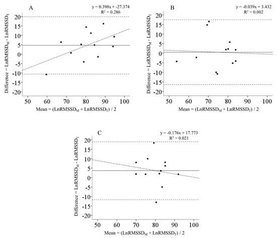 Bland–Altman plots comparing heart rate variability recorded upon waking (LnRMSSDM) and heart rate variability recorded upon arriving at the training facility (LnRMSSDT) during the (A) baseline, (B) post-overload, and (C) post-taper test sessions. The solid lines represent the mean bias while the horizontal dashed lines represent the 95% limits of agreement. The dashed-dotted regression lines represent the trend between the differences and means.