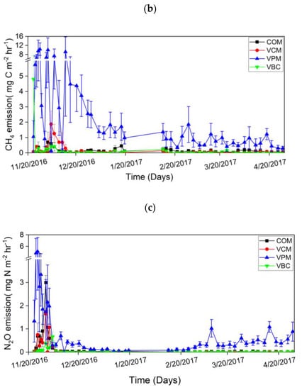 - Szanto, G.L.; Hamelers, H.V.M.; Rulkens, W.H.; Veeken, A.H.M. NH3, N2O and CH4 Emissions during Passively Aerated Composting of Straw-Rich Pig Manure. Bioresour. Technol. 2007, 98, 2659–2670. [Google Scholar] [CrossRef]