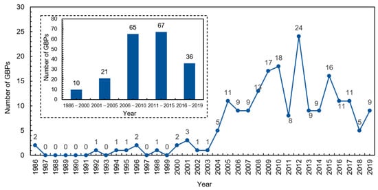 From Figure 1, it can be seen that before 2004, the number of GBPs published each year was less than four. However, since 2004, the number of GBPs has increased steadily, with five or more GBPs published each year. According to the number of policies published each year and the Five-Year Plan, five stages (i.e., 1986–2000, 2001–2005, 2006–2010, 2011–2015, and 2016–2019) were grouped for further analysis. The Five-Year Plan was selected because it is regarded one of the most important national policies in China and has been successfully applied in other policy studies [38,39].