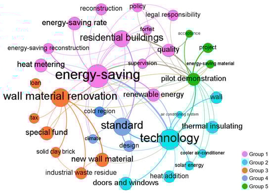 The co-occurrence relationships of 35 keywords extracted from 13 GBPs of stage 1 are visualized in Figure 2. These keywords were clustered into five groups, representing the different GBP topics. It can be seen that “energy-saving,” “technology,” “wall material renovation,” “standard,” and “pilot demonstration” were the most important GBP topics in stage 1.