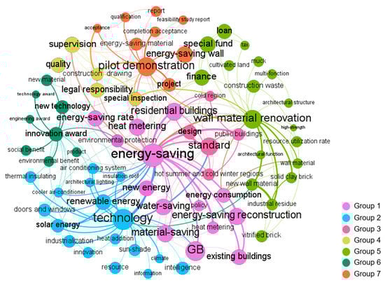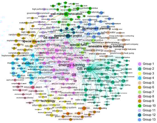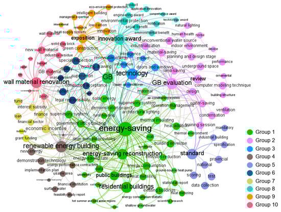 Regarding GBPs in stage 3, 138 keywords were extracted to identify the policy topics and were clustered into 10 groups. As shown in Figure 4, “energy-saving,” “GB evaluation,” “technology,” “renewable energy building,” “standard,” “supervision,” “special fund,” “innovation award,” “exposition,” and “wall material renovation” were the most frequent keywords in each group.