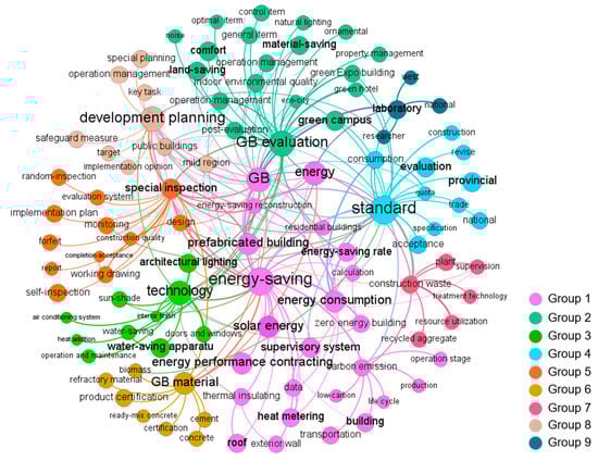 In the last stage, 104 keywords were clustered into nine topics (see Figure 6): energy-saving, GB evaluation, technology, standard, supervision, GB material, construction waste, development planning, and laboratory.