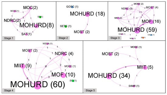 In stage 4, the number of agencies decreased, whereas their collaborative relationships became closer. An interesting finding is that policies issued by MOHURD alone in this stage account for a higher proportion than those issued by MOHURD alone in the previous stage, which showed that MOHURD’s centralized responsibility in GB policymaking began to return. In addition, MOHURD and MIIT had the closest cooperative relationships, as numerous industry planning and standards were issued in this stage.