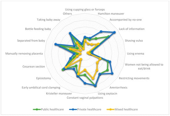 Figure 1. Interventions while giving birth according to received healthcare type.