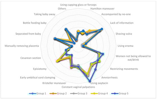 On the OV concept, we found that excessive interventionism and medicalization in physiological processes belong to part of some of their definitions and, hence, this part does not represent a whole. Thus, it seems plausible that, although excessive interventions are representative of the OV concept [35], as our multivariate model demonstrates, they do not represent the whole OV concept. This is why we found some results, such as distributing interventions into cluster groups, which are based on how women perceive OV.