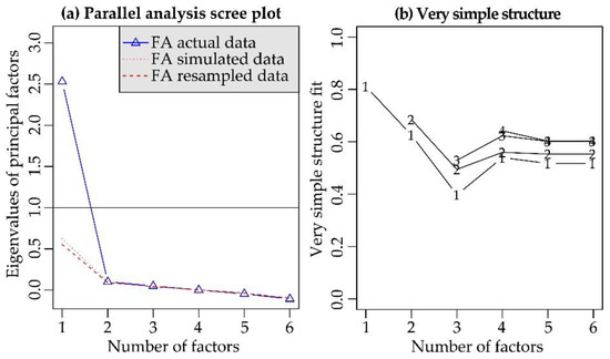 Bartlett’s test of sphericity suggested that there was a sufficiently significant correlation in the data for factor analysis, χ2(15) = 726.93, p < 0.001. The KMO measure of sampling adequacy indicated that the data seemed appropriate for factor analysis (KMO = 0.85). Both the parallel analysis and the very simple structure analysis revealed that the scale was unidimensional. We show in Figure 1a the parallel analysis scree plot and in Figure 1b the very simple structure.