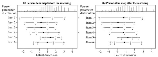 We conducted the Rasch analysis through the partial credit model [74]. We first considered the monotonicity, examining the person-item map. As represented in Figure 2a, there was not monotonicity in the responses, given that the scores pertaining to items 1 and 4 did not have ordered thresholds. Therefore, we rescored items 1 and 4 to account for violations of the monotonicity assumptions. Specifically, the response scale for the two items changed from 1, 2, 3, 4, 5 to 1, 1, 2, 3, 4. We re-analyzed the monotonicity, which resulted confirmed, as indicated in Figure 2b.