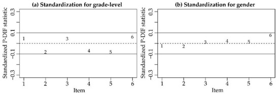 Representation of the standardized P-DIF statistic for (a) grade-level and (b) gender.