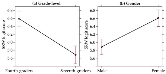 SRW logit score according to (a) grade-level and (b) gender. The bars represent the 95% CI.
