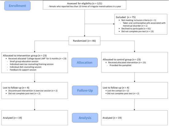 This study’s subjects were selected among 121 female students in the undergraduate and graduate school of K-University from a study conducted in 2017 [15]. The selection criteria were female students who reported irregular menstruation and menstruating less than 10 times in a year. Exclusion criteria were female students taking oral contraceptive pills (estrogen, progestin) or other drugs associated with menstrual disorder, or those under pertinent care.