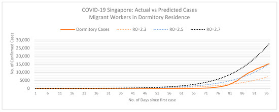 Exponential growth of COVID-19 in Singapore of Migrant Workers living in Dormitories. Dotted lines represent differing COVID-19 basic reproduction numbers (R0). Data retrieved from the Singapore Ministry of Health and the WHO [68,69]. Last updated on 2 May 2020.