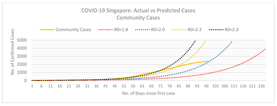 Logarithmic scale. Doubling time of conformed Community cases in Singapore. Data retrieved from the Singapore Ministry of Health and the WHO [68,69]. Last updated on 1 May 2020.