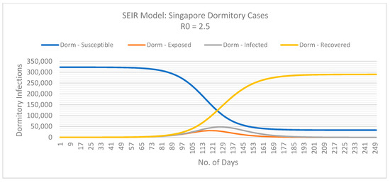 Predicted dynamics of the COVID-19 outbreak within the migrant worker population in Singapore living in dormitories. Basic reproduction number (R0) is 2.5. Data retrieved from the Singapore Ministry of Health and the WHO [68,69].