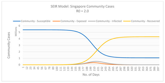 To determine the rate of infection (β), we considered the incubation rate (σ), recovery rate (γ), and the basic reproduction number (R0) [72]. Initial studies estimated R0 for COVID-19 to be between 1.4–3.8 with a median value of 2.2, denoting on average each infected person infects 2.2 others [73]. In order to estimate the initial basic reproduction number for dormitory cases and community cases, we will trial values of R0 from the suggested estimated range (1.4–3.8) to demonstrate various predictions of the COVID-19 pandemic in Singapore for migrant workers living in dormitories and the rest of the population not confined to these spaces.