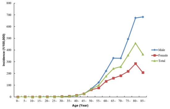 Among all of the age groups, lung cancer was less common in people under 30 years old (4.8%) and more common from 40 to 70 years old (83.7%). During 2008 to 2018, the mean age at diagnosis of total lung cancer cases in Shenzhen was 62.9 years old. The age-specific incidence rate was relatively low until the age of 40, and had since increased sharply. The incidence rate in females peaked in the age group of 80–84 years, and then began to decline. By comparison, the incidence rate in males reached a peak after 85 years (Figure 1).