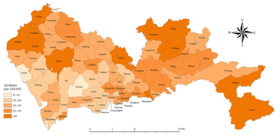 There are three main histological classifications of lung cancer, adenocarcinoma (ADC), squamous cell carcinoma (SQCC) and small cell carcinoma (SMCC), accounting for about 40%, 25–30% and 10–15% of all lung cancers, respectively []. ADC and SQCC both belong to non-small cell lung cancer, among which, ADC mainly occurs in the peripheral bronchi, while SQCC mainly occurs in the main bronchi. The SMCC of the lung is an invasive tumor of neuroendocrine origin with a high degree of malignancy, strong aggressiveness and almost no bronchial invasion. Although the incidence of SMCC has tended to decline, it remains one of the important causes of lung cancer death. In recent years, many studies have reported the temporal variation trend of lung cancer by sex and histological type. According to the statistics from the World Health Organization, ADC has overtaken SQCC as the most common type of lung cancer in many countries []. In China, similar results were reported in several studies of temporal trends in lung cancer histological types. The studies in Beijing, Tianjin, and Sichuan all reported an increasing trend in ADC [,,]. Although the incidence of SQCC was decreasing, SQCC remained the most common histologic type of lung cancer in males in Tianjin []. They suggest that the decline in smoking prevalence may partly explain the change in long-term trends in SQCC incidence and histological types. In foreign countries, the incidence trend of different histological types of lung cancer was noticed earlier than in China. A Japanese study reported a decreasing rate in SQCC and SMCC, and an increasing rate in ADC []. Similarly, an increasing incidence of ADC in lung cancer in both males and females was observed in Estonia []. This trend may be related to the difference of historical patterns of tobacco use or to modern filtered cigarette smoke []. Especially, with the advent of e-cigarettes, the variation about incidence trend and histological types of lung cancer will become more complex. Some studies have confirmed that exposure to e-cigarettes can induce lung adenocarcinoma, induce DNA damage in the lungs, and inhibits DNA repair in lung tissues in mice [,]. Moreover, an aging population and improved diagnostic techniques are likely to lead to an increase in lung cancer rates. However, so far, there are still few studies on the incidence trend of lung cancer by histological type in China, especially in southern China. On the other hand, the spatial distribution of lung cancer incidence has become a hot topic. A study from Saudi Arabia using spatial autocorrelation analysis revealed a statistically significant positive correlation in male lung cancer indicated a clustering pattern []. They believed that the aggregation of lung cancer in eastern regions may be partly due to the high prevalence of smoking. Moreover, other environmental factors are also important. An increase in lung cancer rates was linked to PM2.5 and ozone pollution, according to a study that combined lung cancer incidence with air pollution data from different regions []. Notably, different regions have obvious spatial heterogeneity in terms of climatic conditions, economic structure and industrial structure, resulting in different environmental pollution conditions. To explore the aggregation of cancer incidence in a certain area is helpful to analyze the relationship between cancer and various risk factors, and to carry out targeted prevention.