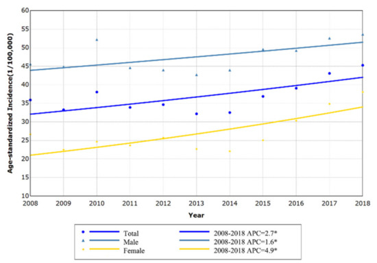Based on the Chinese standard population in 2000, the APC of the age-standardized incidence rate of lung cancer by sex was calculated. The CSR of lung cancer in Shenzhen showed an increasing trend (APC: 2.7%; p = 0.011) between 2008 and 2018. Among them, the CSR in females (APC: 4.9%; p = 0.005) increased slightly faster than males (APC: 1.6%; p = 0.044) (Figure 4).