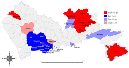 We further made a LISA cluster map (Figure 5) to show the spatial clustering of local areas. The LISA visualization analysis demonstrated the presence of a hotspot (high–high) of lung cancer incidence in the Songgang Subdistrict of the Luohu District, the Nanao Subdistrict of the Dapeng District and several subdistricts of Pingshan and Longgang District. The low–low region represented by blue belongs to the coldspot that included the Futian District and the southern Longhua District (Minzhi Subdistrict). The high–low area on the map which included the Shiyan Subdistrict and the Qingshuihe Subdistrict, indicated that these two subdistricts are high incidence subdistricts compared to other surrounding subdistricts. On the contrary, the Haishan Subdistrict, Longcheng Subdistrict and Kuicong Subdistrict which belongs to a low–high region were the lowest incidence subdistricts compared to other surrounding subdistricts.